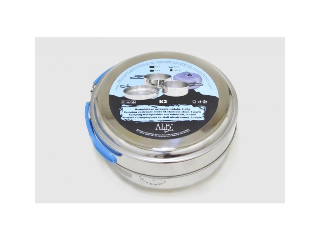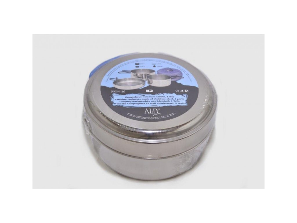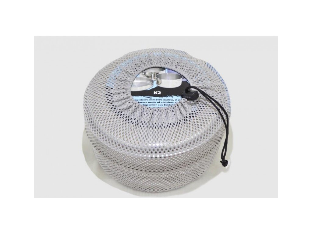 Trojdílná sada nerezového nádobíSada „K2“ je kompromisem mezi sadou „Makalu“ a „Everest“. Je vyrobena z kvalitního nerezu CrNi 18/10 s povrchem vně leštěným, uvnitř broušeným. Pánev i misky mají lemovku a jsou vybaveny sklopnými držadly. Misky mají ve dně prolis pro lepší stabilitu.