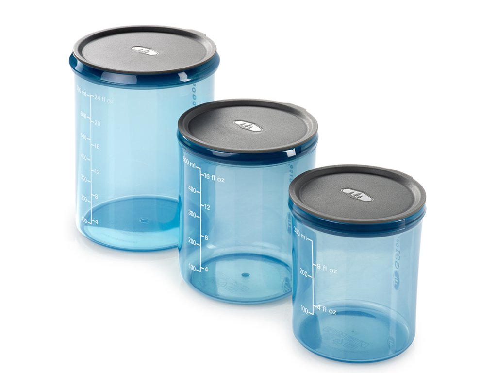 Sada nádob s těsnícím víkem pro skladování potravin.Nepostradatelné nádoby s těsnícím víkem pro skladování potravin. Nádoby jsou vyrobeny z BPA FREE plastu Infinity (čirý polypropylen). Vysoká mechanická odolnost materiálu spolu s jednoduše uzavíratelným víkem zajišťuje, že vaše jídlo bude bezpečně uzavřeno a uloženo. Všechny tři nádoby jsou opatřeny stupnicí objemu a pro maximální úsporu místa lze nádoby složit do sebe.