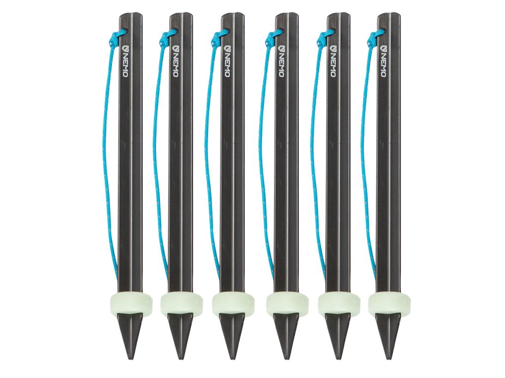 stanové kolíky s fosforeskujícím kroužkem Kolíky ke stanu od značky Nemo mají tvar písmene Y, díky kterému výborně drží v blátivém terénu nebo sněhu. Navíc jsou opatřeny kroužkem z polymeru, který ve tmě fosforeskuje a kolík je tak dobře viditelný. Kroužek lze po kolíku posouvat a tím ho navíc po vytažení ze země jednoudše očistíte. výhody kolíků Sweepstake (6-Pack): Odolný materiál, nízká váha (120 g / 6 ks), výborná viditelnost ve tmě.