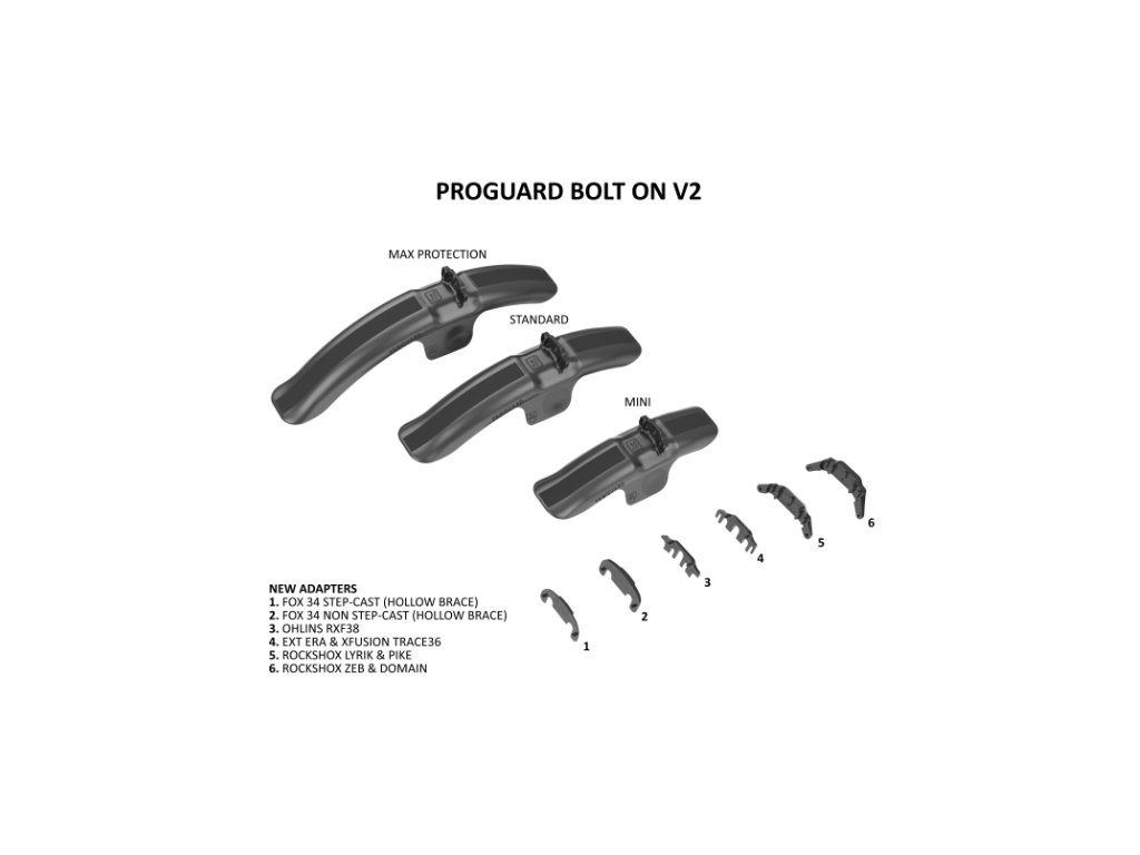 ProGuard - BOLT ON v2 je evolucí vysoce ceněného blatníku ProGuard v1, který nabízí vynikající ochranu s nejúhlednějším továrním vzhledem. Nový typ se zvýšenou kompatibilitou s vidlicemi, zlepšením vůle ve spodní části a MAX PROTECTION velikostí, takže model v2 je nejlépe kompatibilním blatníkem svého typu na trhu (velikost MAX PROTECTION se vzhledem k velikosti nedoporučuje pro agresivní sjezd).