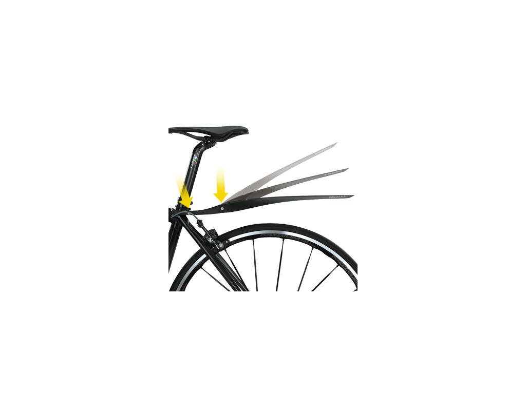 Set blatníků na silniční kolo až do velikosti pláště 700 x 25c. Blatníky nabízí systém rychlého upnutí, kdy demontáž blatníku je otázkou několika málo vteřin. Blatníky jsou vyrobeny z vysoce odolného plastu, kdy spodní díl blatníku má leštěný povrch, který zabraňuje usazování nečistot. Blatníky vynikají nízkou hmotností 39g/117g a snadnou manipulací. Blatníky ke své montáží nepotřebují klasické navářky na rámu a dají se skvěle nastavit do optimální pozice