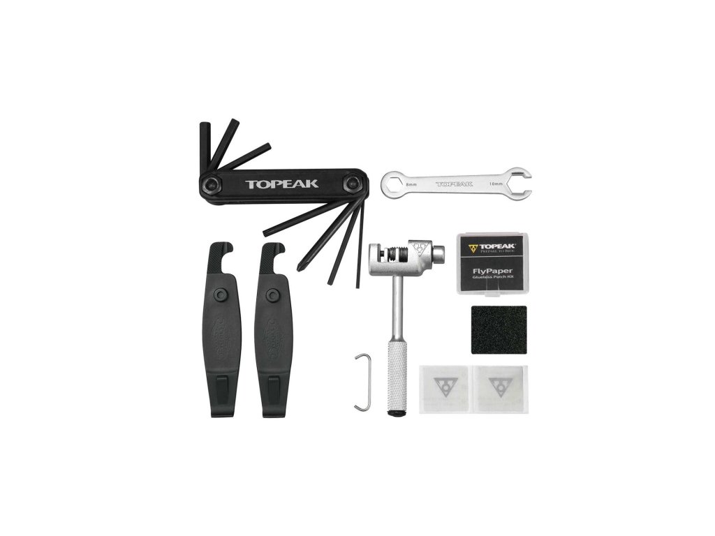 Součásti balení je nářadí se 13 funkcemi. Obsahuje: imbusy 2, 3, 4, 5 a 6 mm, torx klíč T25, křížový a plochý šroubovák, 8 a 10 klíč, nýtovačku na řetěz, sadu samolepicích záplat, montpáky.