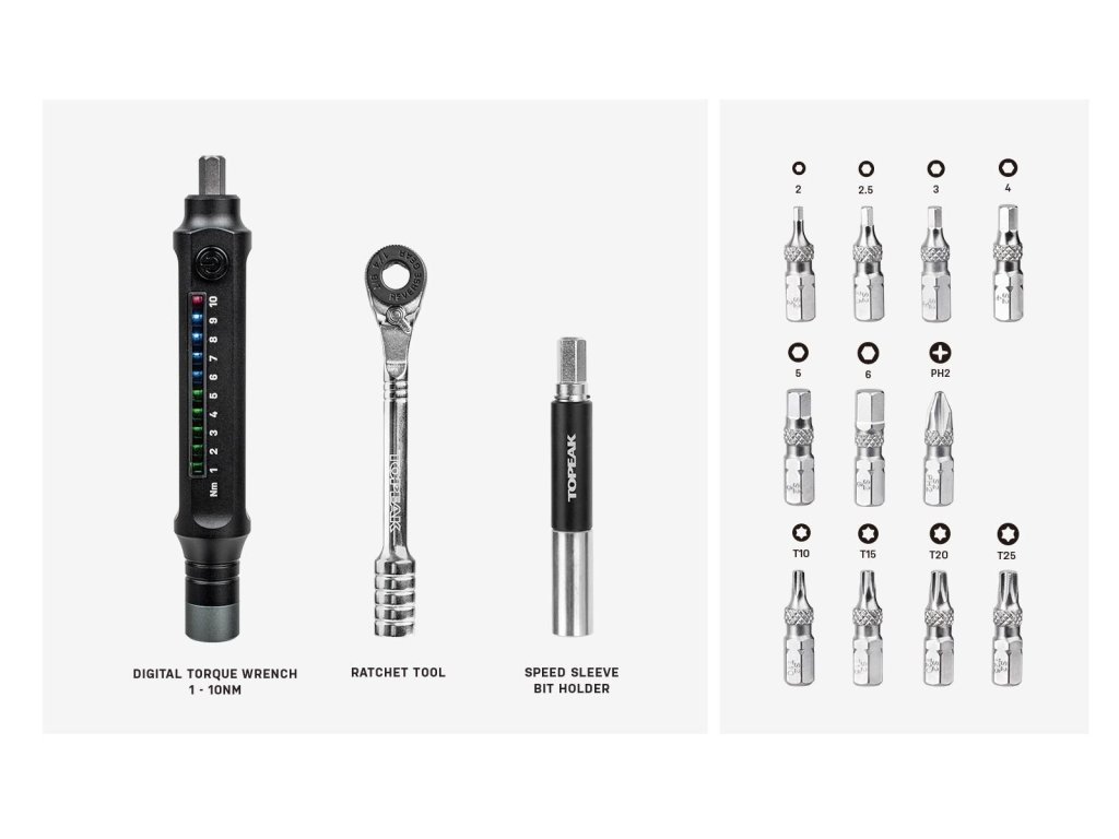 Lehký přenosný digitální momentový klíč s LED indikátory odpovídajícími rozsahu 1–10 Nm, umožňující uživatelům rychle odečíst aktuální hodnotu momentu. Je vybaven ráčnovým nástrojem a 11 bity, což pokryje širokou škálu venkovních úprav.