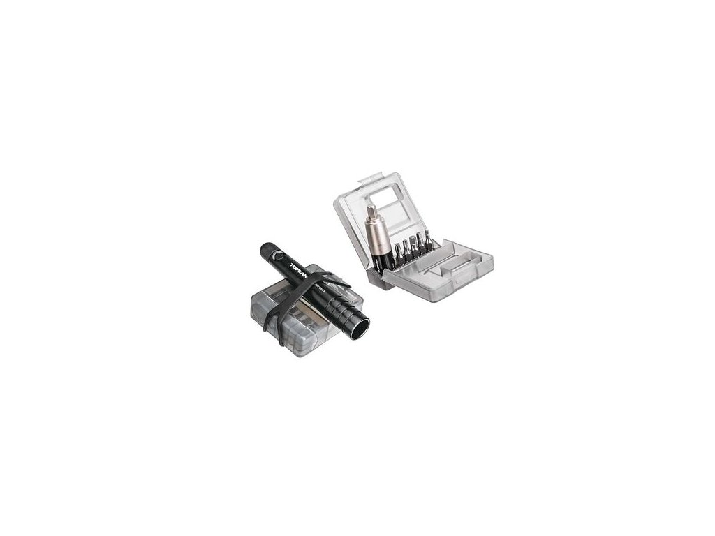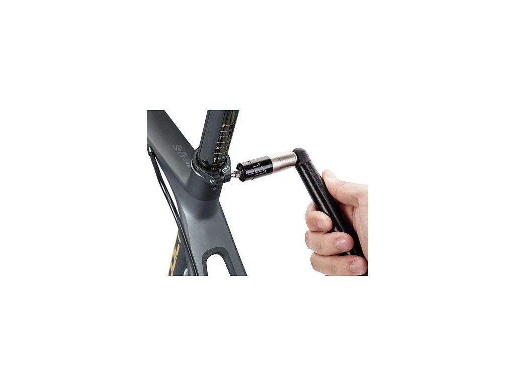 Miniaturní momentový momentový klíč s 2-6Nm nástavcem a sadou základních bitů zamezující poškození, vzniklému přetažením, například drahých karbonových částí. Dva bity mohou být umístěny přímo v těle klíče.