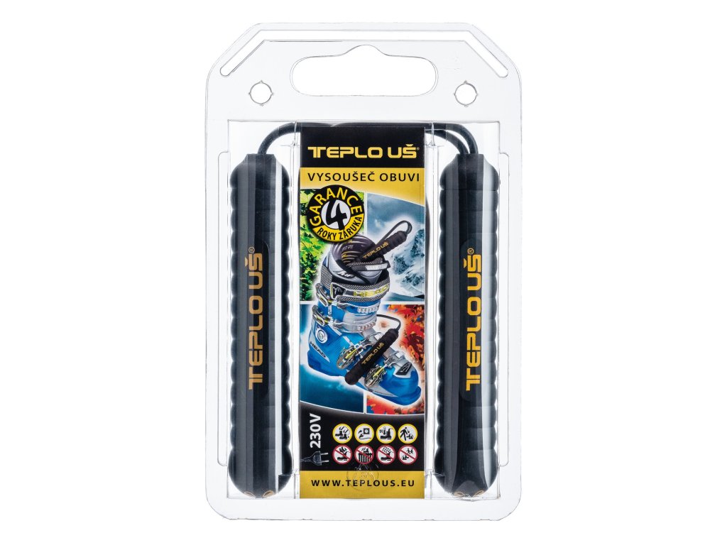 Vysoušeč obuvi VOT 230 TeploUš slouží k vysoušení jednoho páru obuvi (lyžařské, pracovní apod.). Je napájen síťovým napětím 230V/50Hz. Napájecí přívod je připojen do jednoho z těles a z něho je dále napájeno druhé těleso. Celé zařízení je plastové a proti dotyku nebezpečného napětí je chráněno dvojitou izolací. Vyrobeno V ČR záruka 4 roky.